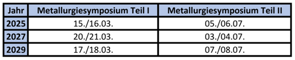 Hier schon gleich die Terminplanung zum Metallurgiesymposium für die nächsten Jahre: